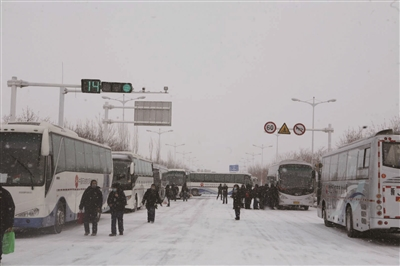 10輛大客車(chē)緩緩啟動(dòng),雪地上留下一道道車(chē)轍,猶如這個(gè)不同尋常的正月留給人們的深深記憶。