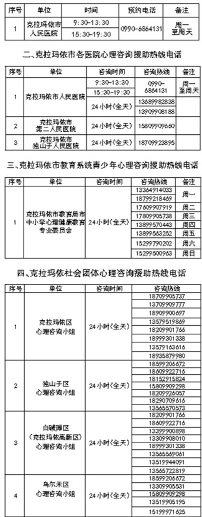 24小時(shí)(全天)心理援助熱線—— 一、克拉瑪依市人民醫(yī)院(市中醫(yī)醫(yī)院)心理咨詢門診