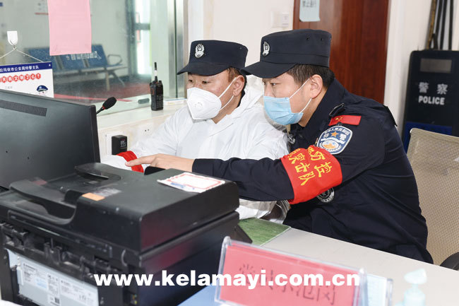 吳濤(右)與防控隊(duì)員核對(duì)檢查站過(guò)往車輛數(shù)據(jù)。本報(bào)記者 李浩然 攝
