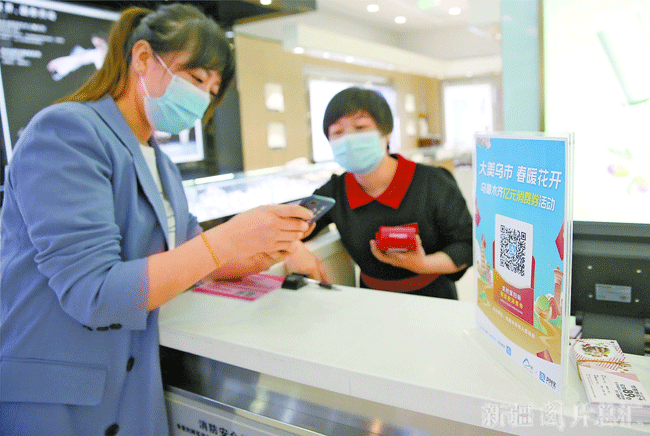 第一期消費(fèi)券可在烏市40家零售企業(yè)、85家餐飲企業(yè),以及470家社區(qū)蔬菜副食品直銷點(diǎn)、社區(qū)便民牛羊肉直銷點(diǎn)內(nèi)使用。19日,烏市市民張艷在天山區(qū)東門街道前進(jìn)西路社區(qū)蔬菜店購(gòu)買蔬菜、調(diào)味品等,總計(jì)50多元。用支付寶交錢時(shí),金額立刻減了5元。