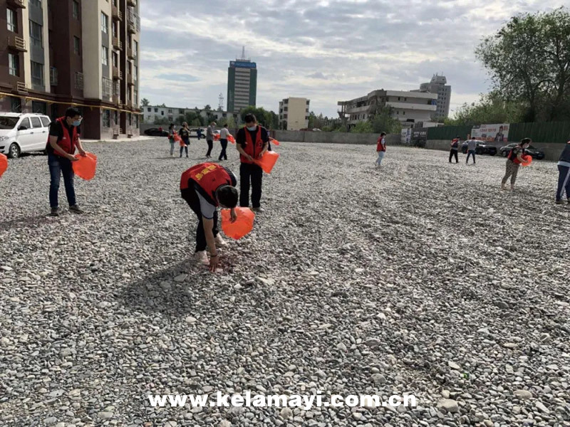獨(dú)山子區(qū)機(jī)關(guān)干部在第三居民區(qū)撿拾垃圾。 本報(bào)通訊員 董哲 攝