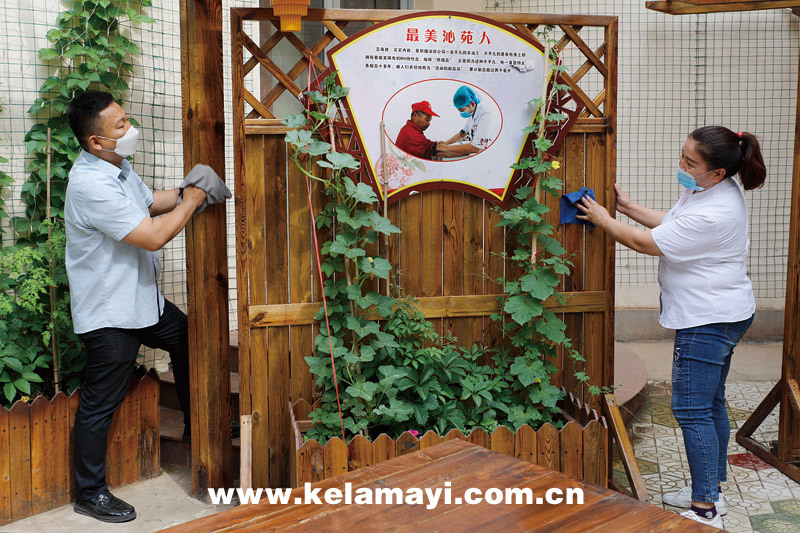 風(fēng)城油田作業(yè)區(qū)員工清掃生活區(qū)域。 圖片由烏爾禾區(qū)宣傳部提供