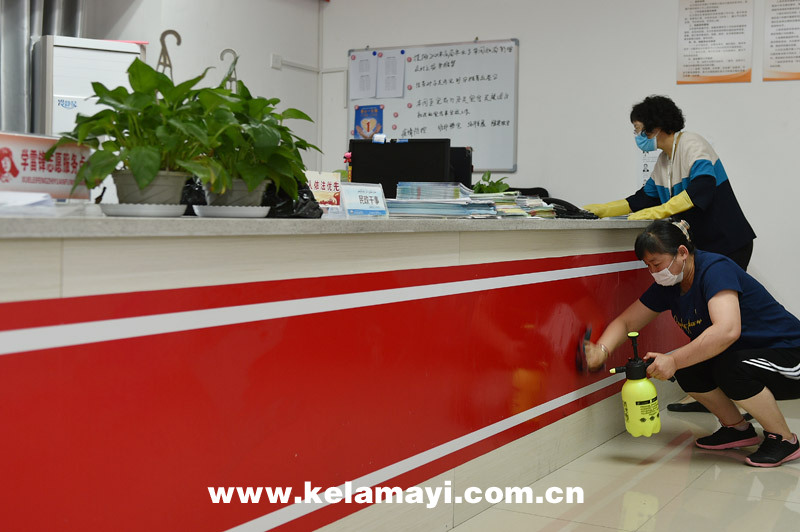 本報(bào)記者 蔣劍 攝 克拉瑪依區(qū)紅文苑社區(qū)工作人員對(duì)工作臺(tái)進(jìn)行消毒清潔。