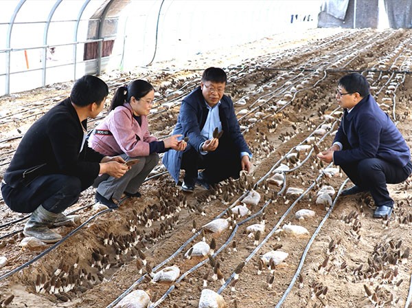 常明昌(右二)正在講解推廣蘑菇種植實(shí)用技術(shù)。(受訪者供圖)