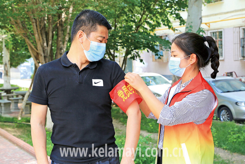 ????白堿灘區(qū)(克拉瑪依高新區(qū))躍進(jìn)社區(qū)志愿者王雪英正在給丈夫田玉清帶上黨員突擊隊(duì)的袖標(biāo)。田玉清是一名黨員,社區(qū)招募志愿者的時(shí)候,夫妻倆剛好沒有照顧孩子和老人的牽絆,于是一起報(bào)了名。他們除了要負(fù)責(zé)兩位高齡獨(dú)居老人的生活服務(wù),還要承擔(dān)社區(qū)16棟、17棟36戶居民的生活物資配送。