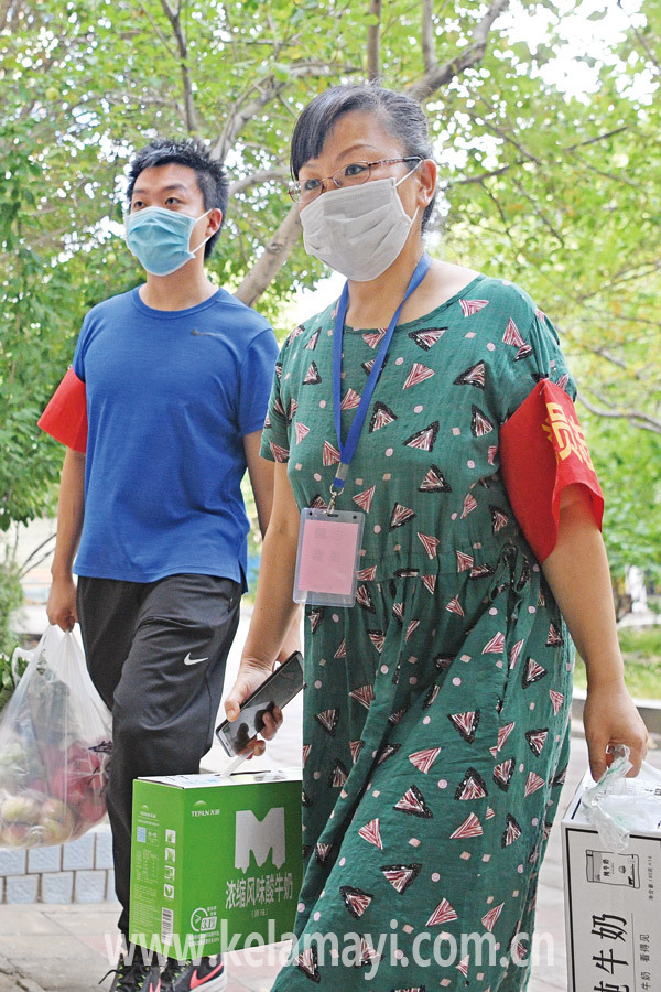 ????市區(qū)通訊花園小區(qū)的“紅細(xì)胞”黨員趙淑霞和兒子李裕杰一同為居民送蔬菜和牛奶。兒子還不是黨員,作為黨員的母親希望兒子能向黨組織靠攏,疫情當(dāng)前,正是錘煉個(gè)人思想境界、體驗(yàn)為人民服務(wù)的快樂的好機(jī)會(huì),于是趙淑霞帶著兒子一起報(bào)名組成了“母子”志愿者。