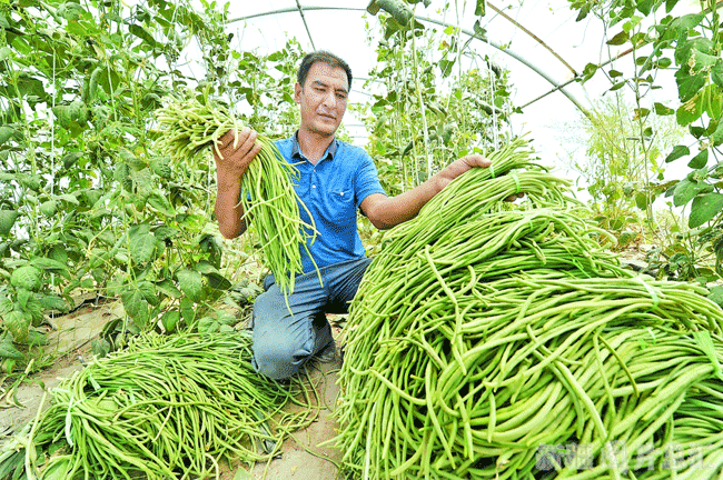 7月7日,莎車縣易地扶貧搬遷安置點(diǎn)萬畝拱棚基地,和諧村村民玉努斯·玉素甫正忙著采摘豇豆。
