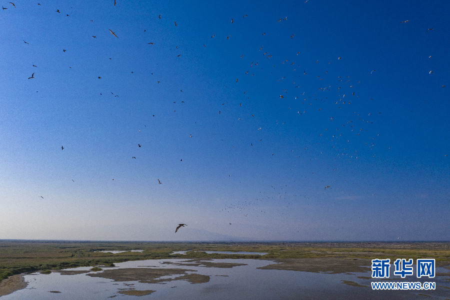 新疆艾比湖濕地國家級自然保護(hù)區(qū)內(nèi)鷗鳥翔集 無人機(jī)照片 新華社記者 胡虎虎 攝