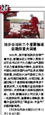 ????2020年,油田公司全力克服疫情影響,持續(xù)加大油氣勘探工作力度,在阜康凹陷、瑪湖凹陷深層、沙灣凹陷3個重要領(lǐng)域相繼獲得重大突破。