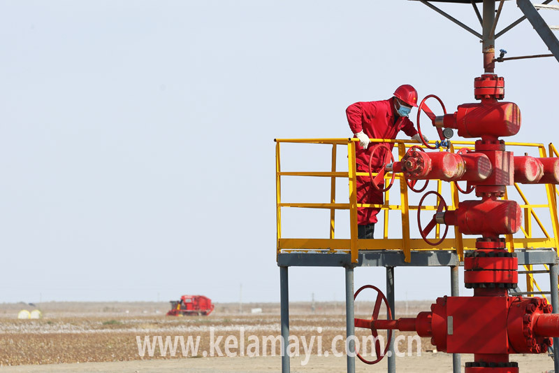 在金龍2井區(qū),新疆油田員工認(rèn)真巡檢確保新井平穩(wěn)投產(chǎn)。 圖片由新疆油田公司提供