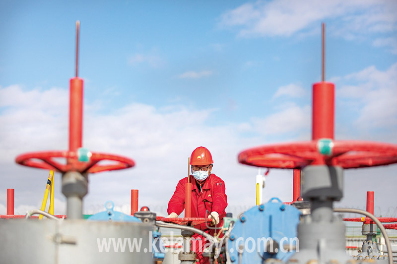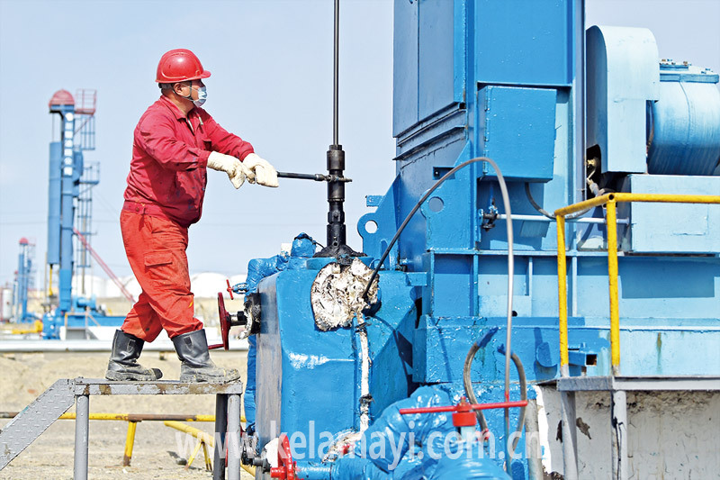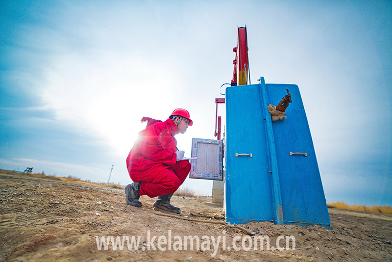 新疆油田公司一線員工正在進(jìn)行井口閘門(mén)緊固。通訊員 張昀 攝