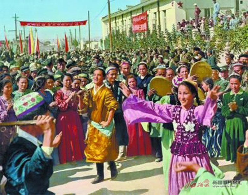 1955年10月1日,烏魯木齊市各族群眾載歌載舞歡慶新疆維吾爾自治區(qū)成立。