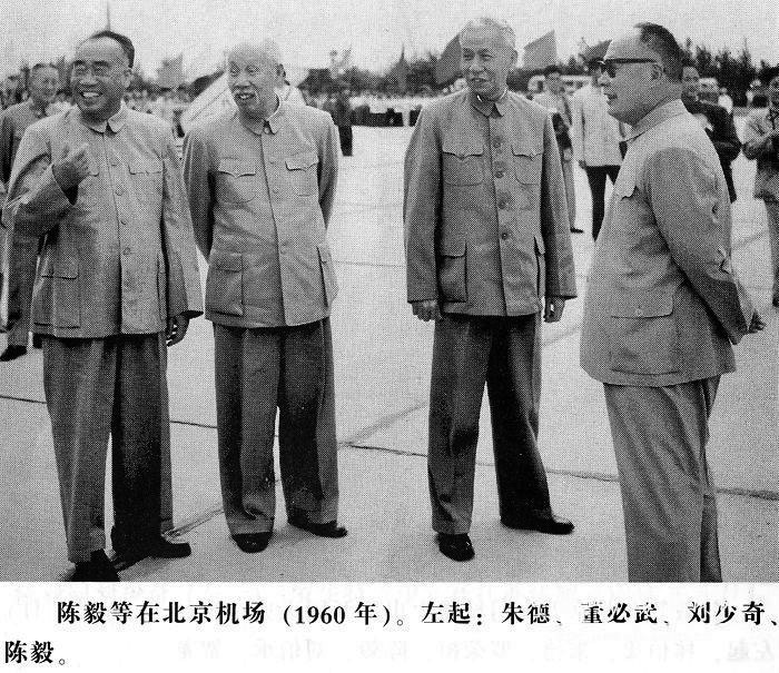 1960年,陳毅等在北京機(jī)場。左起:朱德、董必武、劉少奇、陳毅。