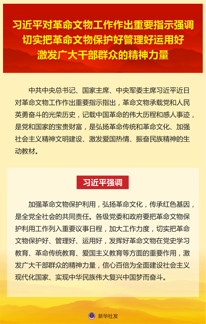 習(xí)近平強(qiáng)調(diào),加強(qiáng)革命文物保護(hù)利用,弘揚(yáng)革命文化,傳承紅色基因,是全黨全社會的共同責(zé)任。各級黨委和政府要把革命文物保護(hù)利用工作列入重要議事日程,加大工作力度,切實(shí)把革命文物保護(hù)好、管理好、運(yùn)用好,發(fā)揮好革命文物在黨史學(xué)習(xí)教育、革命傳統(tǒng)教育、愛國主義教育等方面的重要作用,激發(fā)廣大干部群眾的精神力量,信心百倍為全面建設(shè)社會主義現(xiàn)代化國家、實(shí)現(xiàn)中華民族偉大復(fù)興中國夢而奮斗。