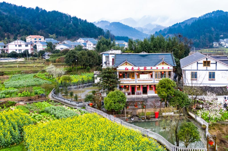 遵義市楓香鎮(zhèn)花茂村村民王治強經(jīng)營的“紅色之家”農(nóng)家樂(2020年2月28日攝,無人機照片)。新華社記者陶亮 攝