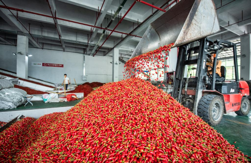工人在遵義市新蒲新區(qū)一家辣椒加工企業(yè)內(nèi)轉(zhuǎn)運辣椒(2020年8月13日攝)。新華社記者陶亮 攝