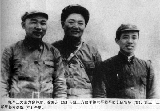紅軍三大主力會師后,徐海東(左)與紅二方面軍第六軍團(tuán)軍團(tuán)長陳伯鈞(右)、第三十二軍軍長羅炳輝(中)合影。