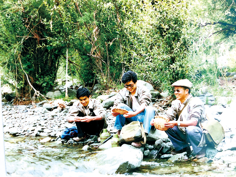 1990年5月,成守德(右)和同事們?cè)诘刭|(zhì)調(diào)查中。啃干馕、喝溪水就是他們的一頓午飯。
