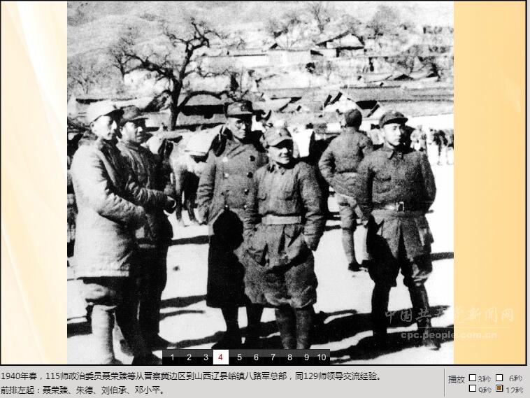 ????1940年春,115師政治委員聶榮臻等從晉察冀邊區(qū)到山西遼縣峪鎮(zhèn)八路軍總部,同129師領(lǐng)導(dǎo)交流經(jīng)驗(yàn)。