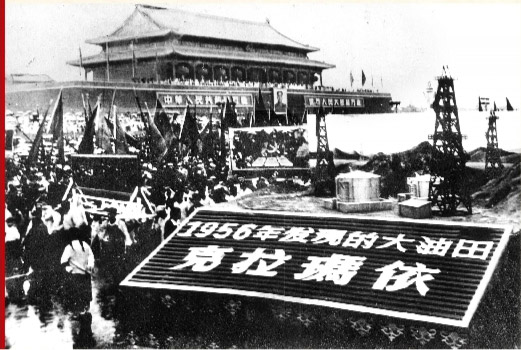 ????1956年10月1日,北京舉行國慶典禮,當(dāng)一輛標(biāo)有“1956年發(fā)現(xiàn)的大油田——克拉瑪依”字樣的巨大模型車緩緩駛過天安門廣場時,毛澤東、周恩來、劉少奇、朱德等黨和國家領(lǐng)導(dǎo)人,頻頻揮手微笑,游行的人群注目歡呼。