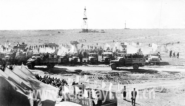 ????3月29日,新疆石油管理局黨委召開(kāi)誓師大會(huì),號(hào)召全局各族職工全力以赴投入百口泉會(huì)戰(zhàn),鼓勵(lì)全局職工“為油大干有理,為油大干有功,為油大干光榮,為油立功者受獎(jiǎng)”。大會(huì)還特別抽調(diào)黨員干部組成23個(gè)蹲點(diǎn)小組,每個(gè)小組由一名處級(jí)干部帶隊(duì),干部與工人同吃、同住、同勞動(dòng)。