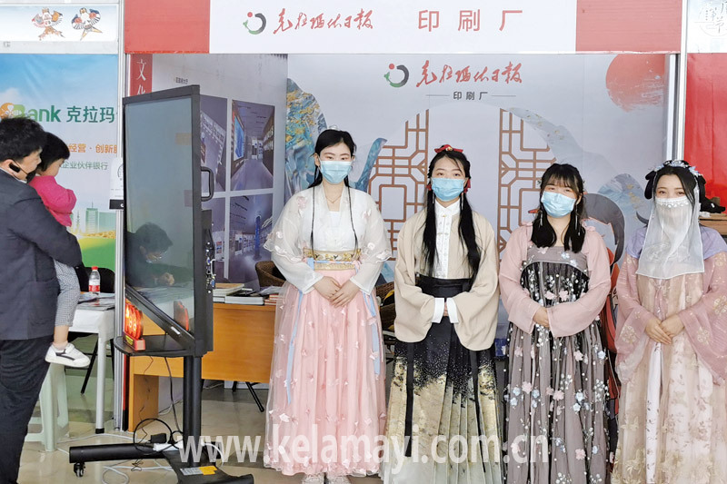 在克拉瑪依日?qǐng)?bào)社印刷廠展示區(qū),身著古裝的工作人員成為展會(huì)上一道靚麗的風(fēng)景。 本報(bào)記者 戴旭虎攝