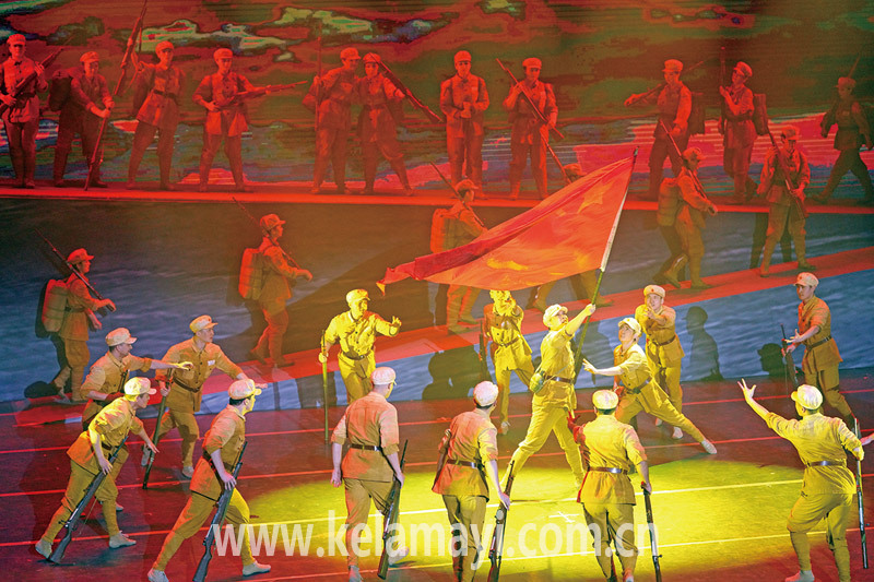 ????“明月出天山,蒼茫云海間。長(zhǎng)風(fēng)幾萬(wàn)里,吹度玉門(mén)關(guān)……”在詩(shī)人李白的《關(guān)山月》中,歷代將士們開(kāi)拓疆土的故事娓娓道來(lái);歌舞《甘泉流萬(wàn)家》講述了戍邊將士開(kāi)墾良田贏得人民喝彩的場(chǎng)景;《凱哥進(jìn)新疆》《穿越死亡之?!贰堆M(mǎn)天山路》……一首首經(jīng)過(guò)改編的曲目描繪了當(dāng)年解放軍進(jìn)入新疆的情景。演員們身著經(jīng)過(guò)歲月洗滌的軍裝,手持著坎土曼、扁擔(dān),再現(xiàn)了軍墾戰(zhàn)士歷經(jīng)千難萬(wàn)險(xiǎn),為新中國(guó)開(kāi)墾戍邊的偉大事跡。