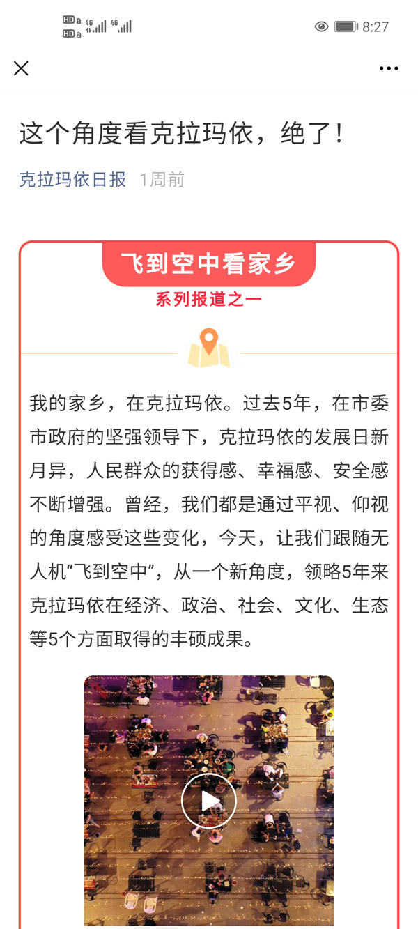 ????“嗨克拉瑪依”新聞客戶(hù)端除開(kāi)設(shè)“喜迎黨代會(huì)”專(zhuān)題,還開(kāi)設(shè)“飛到空中看家鄉(xiāng)”專(zhuān)題,以獨(dú)特的視角引領(lǐng)廣大網(wǎng)友細(xì)數(shù)身邊變化、感受家鄉(xiāng)發(fā)展。