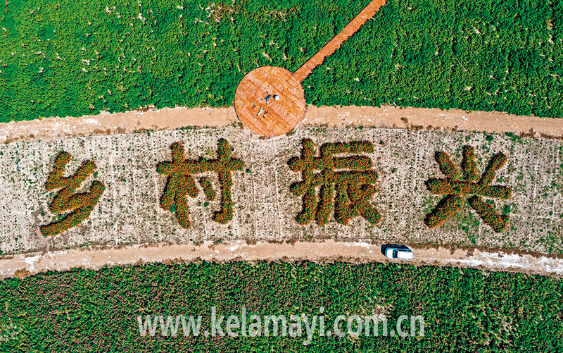 8月22日,烏爾禾區(qū)萬畝海棠林一角,自駕游游客在木棧道上游玩。從高空俯瞰,由綠植、花卉栽種而成的“鄉(xiāng)村振興”四個大字躍然大地之上。本報全媒體首席記者 閔勇 攝