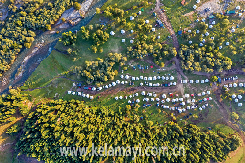 2019年8月13日,獨庫公路喬爾瑪段,一個個用于接待游客的氈房,像一朵朵盛開的白色花朵,綻放在草甸之上、峽谷之中。本報通訊員 田國建攝