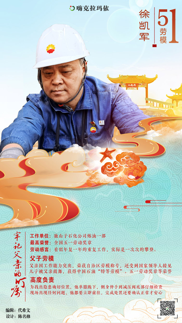 ????徐凱軍是獨(dú)山子石化公司煉油一部工藝技術(shù)員,他的父親徐新才退休前也是該公司職工,同樣獲得過勞模這一榮譽(yù)稱號。