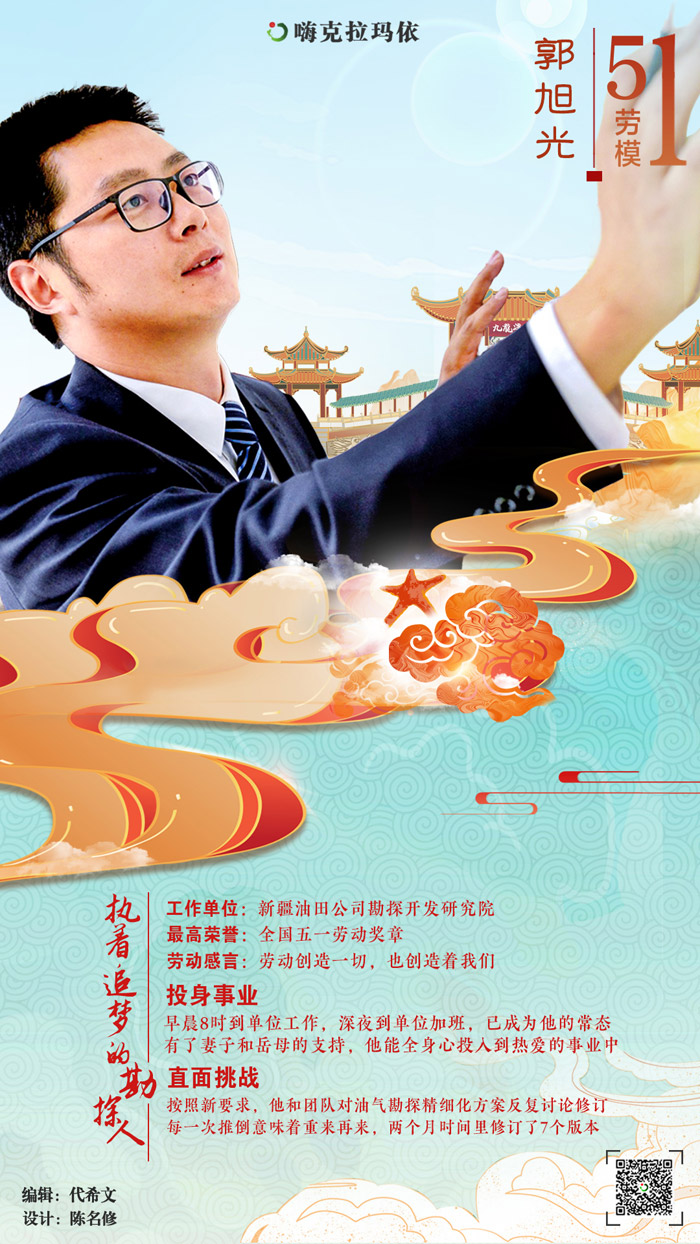 ????今年40歲的郭旭光是新疆油田公司勘探開發(fā)研究院分管勘探的副院長(zhǎng),也是研究院勘探所所長(zhǎng),也是全國(guó)“五一”勞動(dòng)獎(jiǎng)?wù)芦@得者……