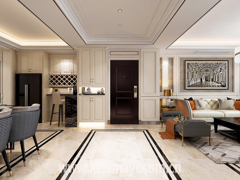 ????設(shè)計(jì)賞析:該案在傳統(tǒng)中式設(shè)計(jì)的基礎(chǔ)上,融入現(xiàn)代設(shè)計(jì)特色,新與舊、典和潮相互統(tǒng)一,營(yíng)造出嶄新的裝飾設(shè)計(jì)風(fēng)格。采用新穎的墻面裝飾壁材,將墻面涂裝產(chǎn)品與軟裝設(shè)計(jì)融為一體是該作品的精髓所在??筒蛷d主色背景選用米白色與金屬元素結(jié)合,搭配棕紅色木質(zhì)家具,為空間注入沉穩(wěn)、質(zhì)樸的氣息??蛷d背景墻、餐廳墻柜面裝飾與過(guò)道墻面裝飾均采用中式布紋效果,在濃濃古韻中打造現(xiàn)代特色的典雅居住環(huán)境。特別的是,房?jī)?nèi)廚房采用隱形推拉門設(shè)計(jì),在保證餐廳采光度的同時(shí),更便于業(yè)主使用。