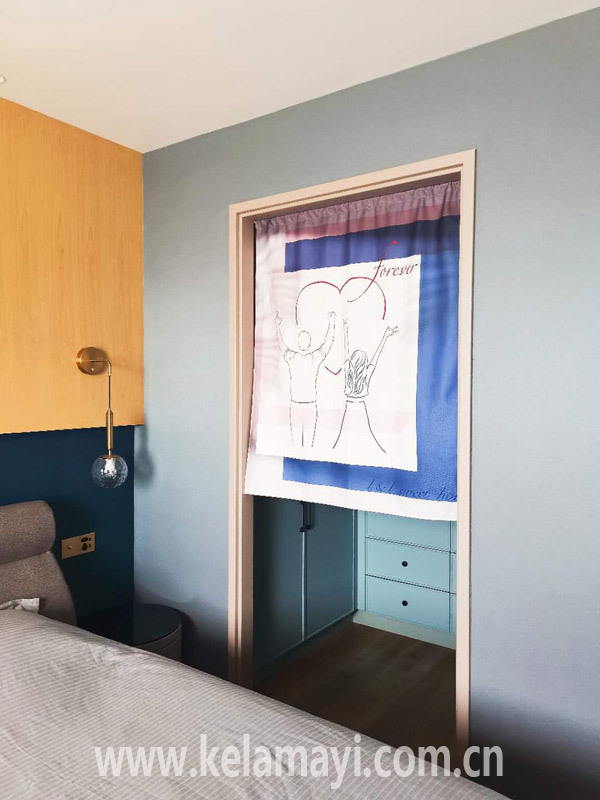 臥室衣帽間門口,掛著以房主形象為元素定制的門簾。