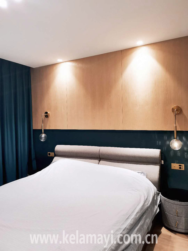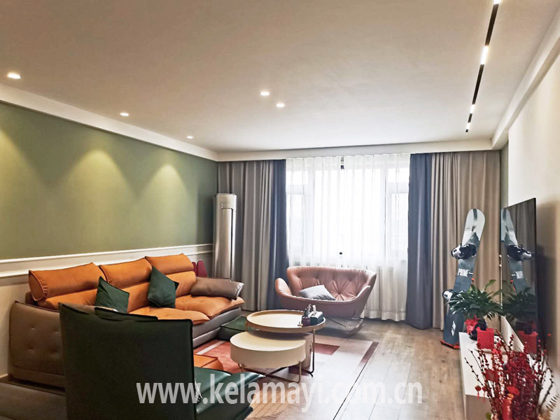 ????“我對顏色的敏感度比較高,我認(rèn)為每個空間都應(yīng)該有相應(yīng)的顏色,營造出相應(yīng)的空間感覺。比如臥室,孔雀藍(lán)色的墻布、昏黃的燈光、嚴(yán)實的遮光簾,我就想要營造一進臥室就想入睡、休息的感覺?!笔Y女士說,“在客廳,大面積的抹茶綠色墻面與白色墻面形成撞色,顯得非常清新,但也需要更亮的顏色來點綴,所以,我特意根據(jù)墻體顏色挑選了橙紅色、墨綠色的沙發(fā)、餐椅,在玄關(guān)背景墻上也做了同色調(diào)的搭配來‘點題’,讓整個家