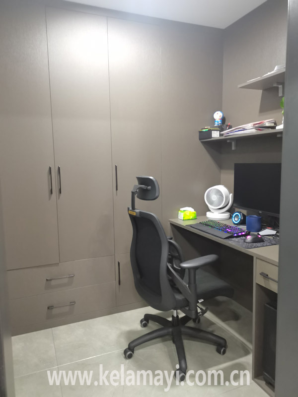 ????吳先生介紹說,他家一進入戶門右手邊有一個面積約30平方米的大臥室,由于臥室門剛好與入戶門相鄰,沒有預留地方做掛衣區(qū)和鞋柜,所以很多業(yè)主選擇將臥室門向內(nèi)移,隔出入戶門廳。?????? 但在吳先生看來,要想解決沒有掛衣區(qū)的問題,還有更好的裝修思路。于是,吳先生通過家居定制的方式,在入戶門右側(cè)做了一個雙面柜,以此對入戶門廳和臥室進行了功能分區(qū)。這樣一來,柜子一邊是掛衣區(qū)、鞋柜,另一邊則隔成了一間小書房和一個大臥室,兩處空間都得到了最大化利用。
