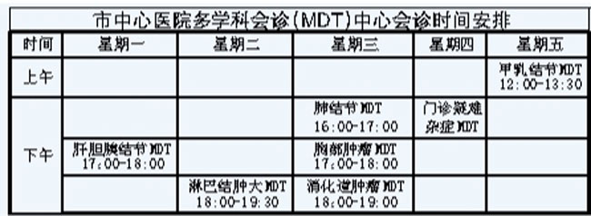 ????多學科聯(lián)合會診(MDT),是由多學科資深專家以共同討論的方式,為患者制定個性化診療方案的過程,是一種“一站式”多學科診療模式。而市中心醫(yī)院成立的“多學科會診(MDT)中心”則整合了7支多學科會診團隊,不同團隊的專家每周在固定時間、固定地點坐診。