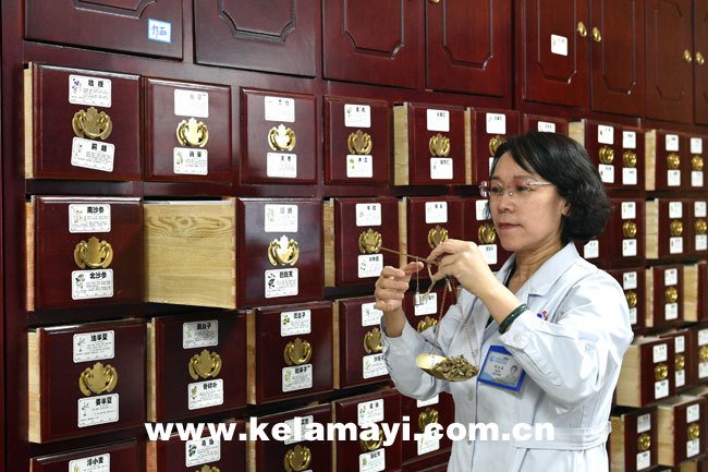 ????位于綜合樓一樓的中藥房布局精巧,古香古色的中藥柜分門別類地存放著各類中草藥,品種多達(dá)四百余種。