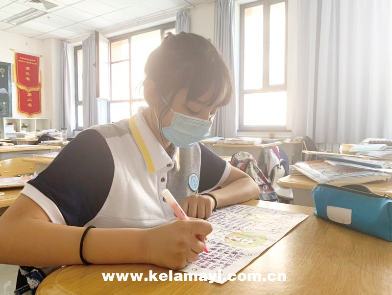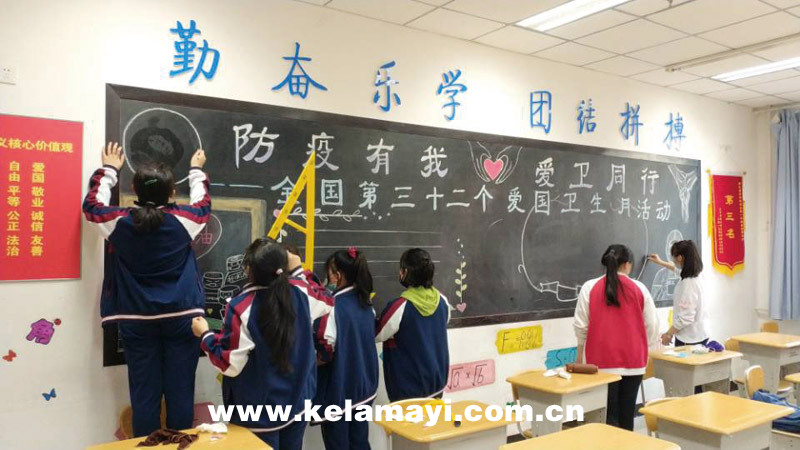 北師大克拉瑪依附校初二4班學(xué)生繪制衛(wèi)生月主題板報。