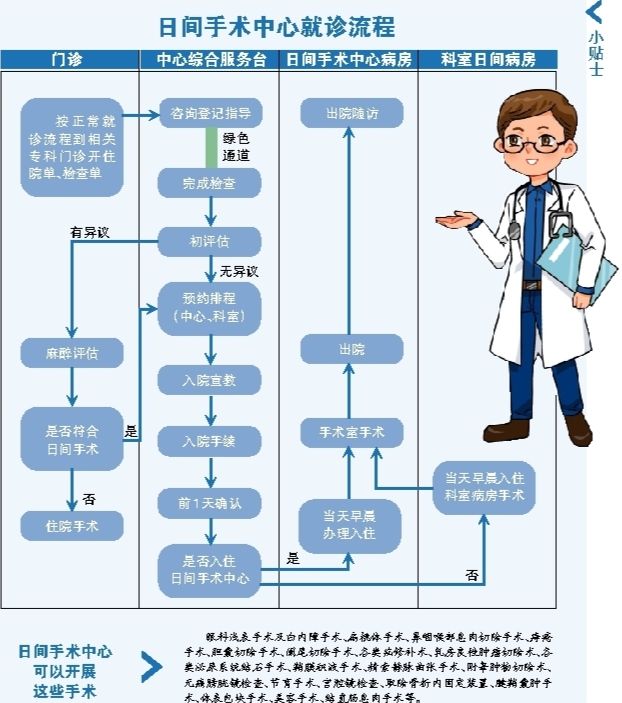 ????日間手術(shù)是一種安全、高效、經(jīng)濟(jì)的新型醫(yī)療模式,是指患者在入院前完成術(shù)前檢查、麻醉評(píng)估、預(yù)約手術(shù)時(shí)間等環(huán)節(jié),當(dāng)日住院、手術(shù), 48小時(shí)內(nèi)出院的一種全新的手術(shù)管理模式。