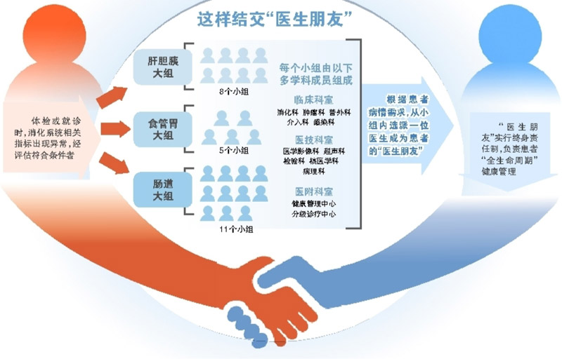 ????現(xiàn)階段“臨床醫(yī)學(xué)研究中心”可以實現(xiàn)的目標(biāo)是:患者進入醫(yī)院,無論屬于哪個診療環(huán)節(jié),一旦有消化系統(tǒng)方面的指標(biāo)異常提示,醫(yī)生就會主動推送患者的個人信息至統(tǒng)一的調(diào)度中心,醫(yī)務(wù)人員匯總整理后將患者分配至相關(guān)專業(yè)組,安排專人進行跟蹤隨訪?;颊呷芷诠芾韺嵭小敖K身負責(zé)制”,即分配專業(yè)醫(yī)生負責(zé)患者的全部健康隨訪,無論是預(yù)約、開藥還是會診,都會有專人協(xié)助完成?;颊咭坏┡浜厢t(yī)生建檔成功,患者甚至其家庭都將擁有一位專業(yè)的“醫(yī)生朋友”。這一過程就是對“院中”生命周期實現(xiàn)的建檔、管理。