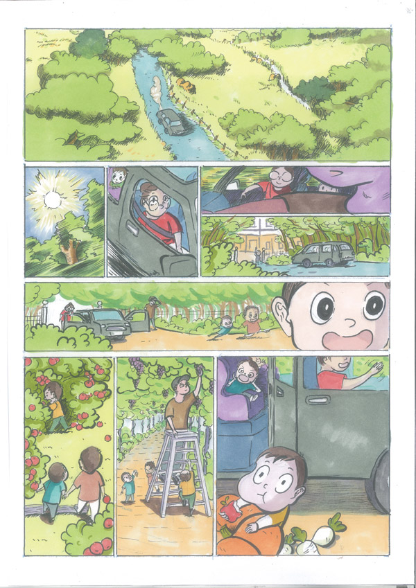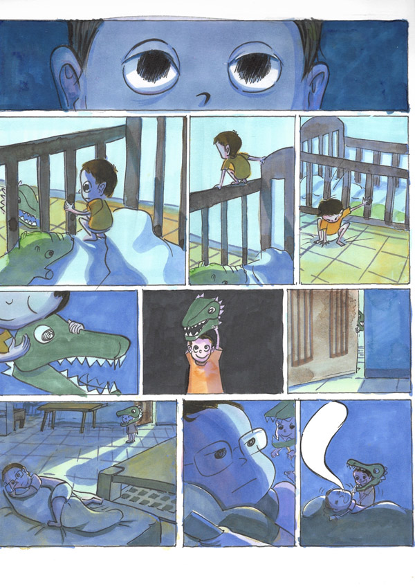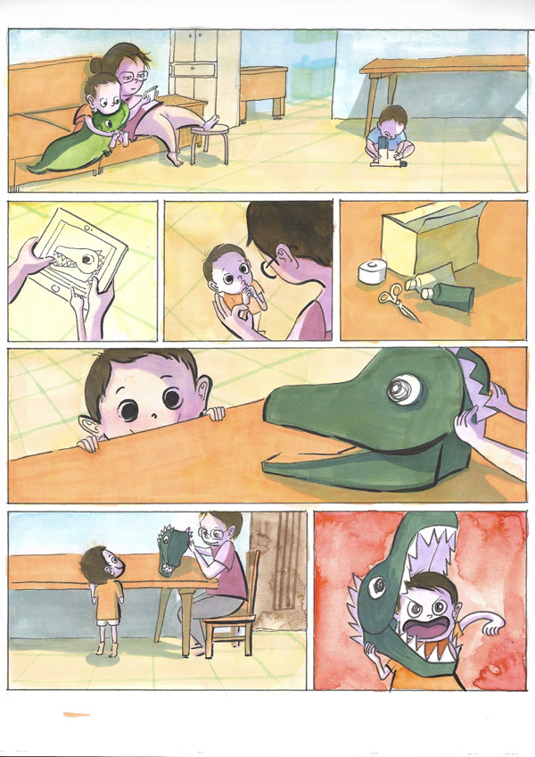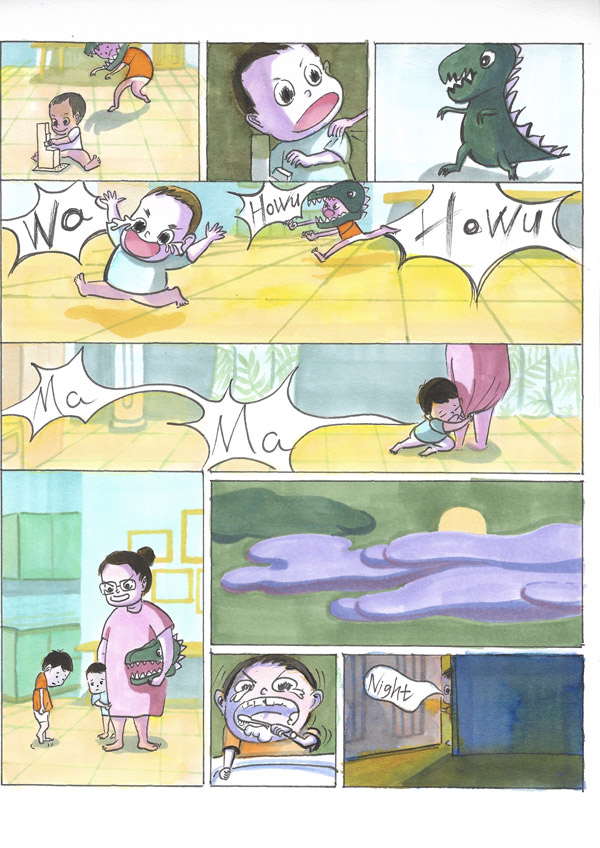 ????孩子們?nèi)ス珗@玩,無意中“拯救”了蚯蚓;小兒子找媽媽時意外發(fā)現(xiàn)了靜電現(xiàn)象;大兒子擁有了一頂恐龍帽子,晚上還不忘帶著它惡作劇……在她的畫夾里,已經(jīng)積累了厚厚一疊畫好的漫畫。
