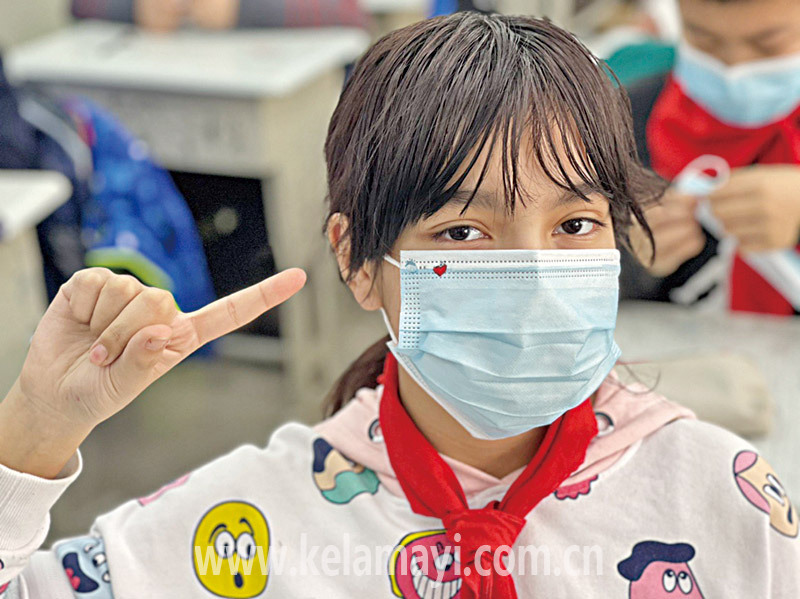 市第一小學(xué)學(xué)生開心地戴上了自己刺繡的口罩。