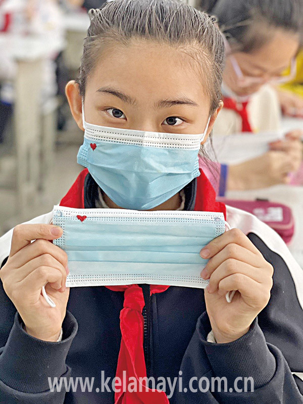 市第一小學(xué)學(xué)生展示縫制了小愛心的口罩。