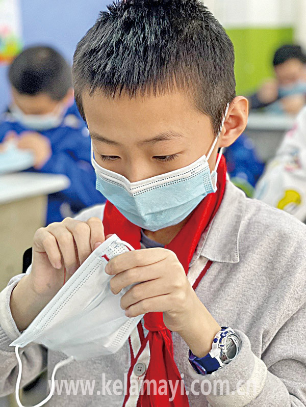 市第一小學(xué)學(xué)生嘗試在口罩邊緣刺繡。