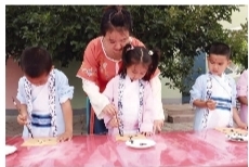 小拐鄉(xiāng)幼兒園的孩子在老師指導(dǎo)下,用毛筆書寫“人”字。圖片由小拐鄉(xiāng)幼兒園提供