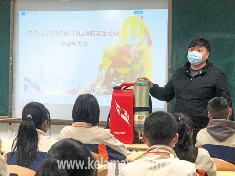 何大用為初三學(xué)生講解背負(fù)式滅火器的使用方法。圖片由市第二中學(xué)提供