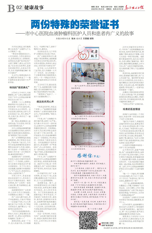 ????這是一場特殊的頒獎典禮,而那兩份特殊的榮譽證書,則是醫(yī)患深情的珍貴見證。