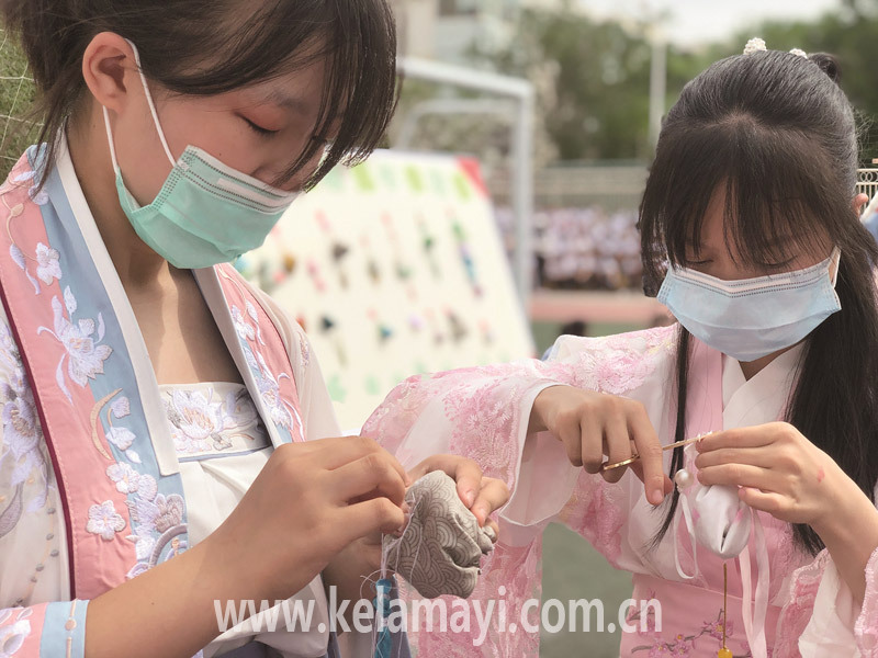 ????還有一些學(xué)生身穿漢服,在活動現(xiàn)場縫制香囊。她們手握針線,縫合出了香囊袋,再將自己喜歡的香料、星星折紙、棉花等物品放置其內(nèi),打結(jié)固定。
