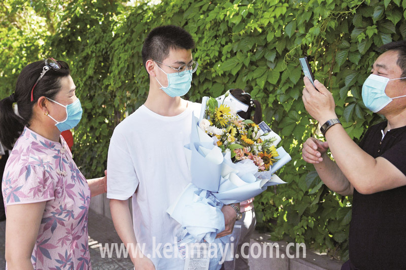 ????在高級中學(xué)考點門口,同樣有許多等待考生的家長,他們有的手捧鮮花、有的身穿寓意“旗開得勝”的旗袍、有人身穿印有“高考必勝”字樣的T恤……考完第一場的考生們步出考點后,家長們紛紛給孩子送上了祝福和寬慰。
